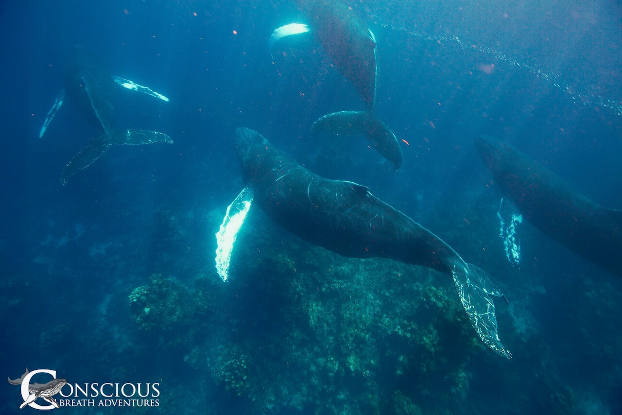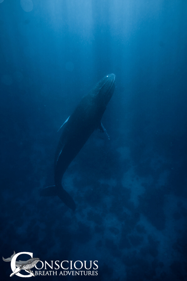Meanwhile, Cat’s group were on a mission to find a singer, no matter how long it took. We’ve never used the hydrophone so much in one week. The group of ten that had come aboard all agreed that a singer was the one thing they were most looking for, and Cat was determined to be the genie that granted their wish. But it isn’t always easy! Sometimes the ocean was completely quiet, and other times we could hear a male sweetly singing very very close. We would jump in the water to listen while looking around for where he might be hiding – we know you are here somewhere, we can feel the vibrations from your song! But the very best singer of the week would come in the final hours of the last day. Gene found a singer two miles upwind. We were a fair way away but how could we resist but to go and join? So we hightailed it over there to find the singer had moved off. Well, with two boats working together, we have a much better chance at triangulating. Cue some of the best teamwork of the whole season – this whale is not only an incredible singer, but also hide and seek champion of the Silver Bank. We took turns to move up wind a little way, plunk in the hydrophone, discuss tactics on the radio – and wait. Then one of us would spot a blow in the distance and we’d race over to the general area, plunk in the hydrophone, talk on the walkie talkie.