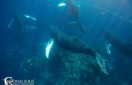Spot, race, hydrophone, radio, repeat. It was getting late and we needed to be back before dark. Spot, race, hydrophone, radio. Then, all of a sudden, as we were waiting for a blow… he surfaced RIGHT next to our boat! Cat slipped right in to mark the whale, the guests followed her in, and he sang so loudly for us we could feel the song through our whole bodies. Then he disappeared into the blue, right over to Gene’s boat to give them a turn. Over the next hour we took one more swim each before it was time to go home. Cat’s group decided to put the hydrophone in for one last listen, so he could sing goodbye to us. But just as we did that, he surfaced RIGHT next to us again! Well, we couldn’t miss an opportunity like that, could we! In we went and this time he came right up beneath us while still singing! Although this happens, it’s relatively unusual to see. Everybody was SO happy, dancing and singing and hugging on the boat, laughing all the way back to the Sea Hunter. It was such a lovely encounter, and we were so delighted to end on a high note (no pun intended)…We had many great encounters throughout the week, on the surface and in the water, but this one was one of the most memorable moments of the whole season. We sure hope that this guy is waiting to give us another show on our last week of 2022!