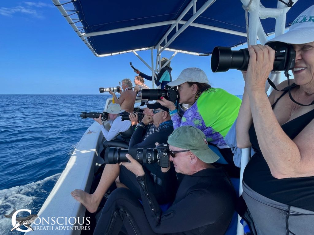 On the topside, this week continued the fantastic action that has been going on all season. Whenever we are not swimming with whales, on top it seems like the whales notch up the energy a little bit more every week, with pec slapping, lobtailing, and plenty of high-energy breaching, sometimes with mom and calf going at it simultaneously. The shows have been really good, and up close and personal, too. Sometimes it definitely feels like the calf is showing off to the boatloads of yelling and hollering visitors, and the photographers were all very happy, too.