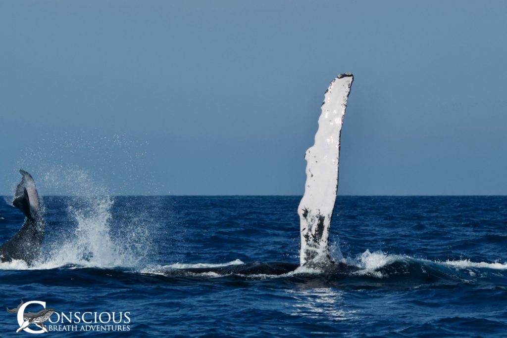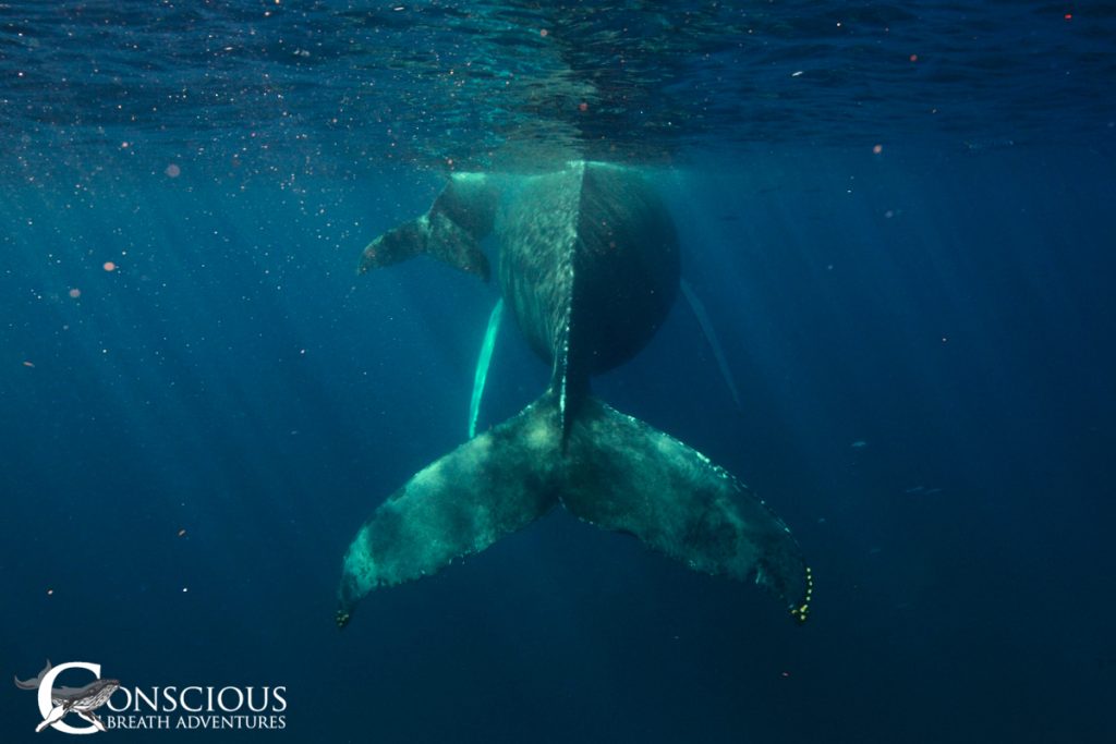 But, in other news this week, we were a little nervous that we might have a stalker out on the Silver Bank… there’s a mum and calf that we have encountered three weeks in a row now! It happens but that’s quite uncommon, and so is mom’s behavior. If you’ve been out on a trip with us before, you probably know that we like to approach the whales once they leave the surface and dive down to rest. When they are resting deeper, as opposed to at the surface, a group of ten humans plopping into the water with their cameras and swimming over to admire them tends to be better received than a direct approach on the surface. However, this mum and calf seem to be the exception to that general rule. For the last three weeks, we’ve come across the pair with mom logging at the surface, usually for twelve or more minutes at a time, and calf resting on her nose. Every time we’ve tried to approach them underwater as usual they sit for a minute or two before gently swimming away. So we tried something different – we all slipped quietly in the water together and approached the sweet duo while they were resting at the surface. And it worked. It worked three weeks ago, it worked again two weeks ago, and this week when we came across them (on Monday, Tuesday AND Wednesday) it worked again. And by this week, mum had picked up an escort too! The encounters on Monday left us especially breathless. The escort hovered in the background for most of the morning, but the mum and calf were ready to get up close and personal. At one point our group were floating in the water when they came right up to check us out together – we even had to backpeddle a little bit to keep a respectful distance. With water so bright and blue and sun rays scattered across the surface it was just beautiful.