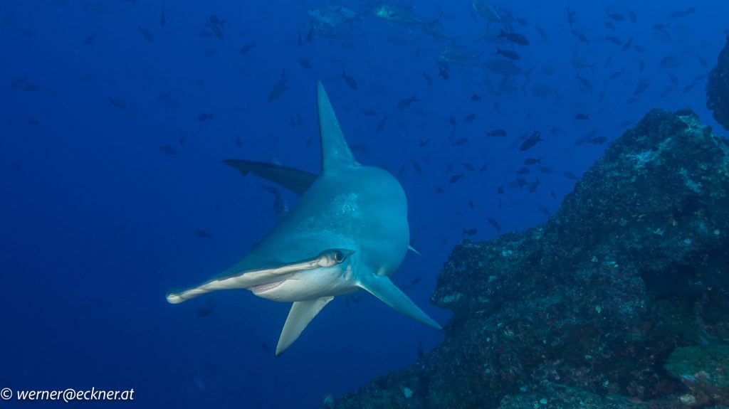 The sixth day we started the dive at Roca Sucia with some hammerheads at the cleaning station, lots of fish clinging to the rock and a huge school of jacks, which we swam in the middle of. Out in the blue we observed some hammerheads during the safety stop. The second dive at Dos Amigos Pequeno was calm, with some Galapagos and Hammerheads passing by.